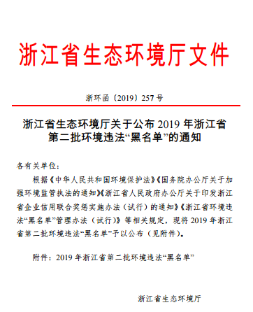 根據《中華人民共和國環境保護法》《國務院辦公廳關于加強環境監管執法的通知》《浙江省人民政府辦公廳關于印發浙江省企業信用聯合獎懲實施辦法(試行)的通知》《浙江省環境違法“黑名單”管理辦法(試行)》等相關規定,現將2019年浙江省第二批環境違法“黑名單”予以公布。詳情如下: